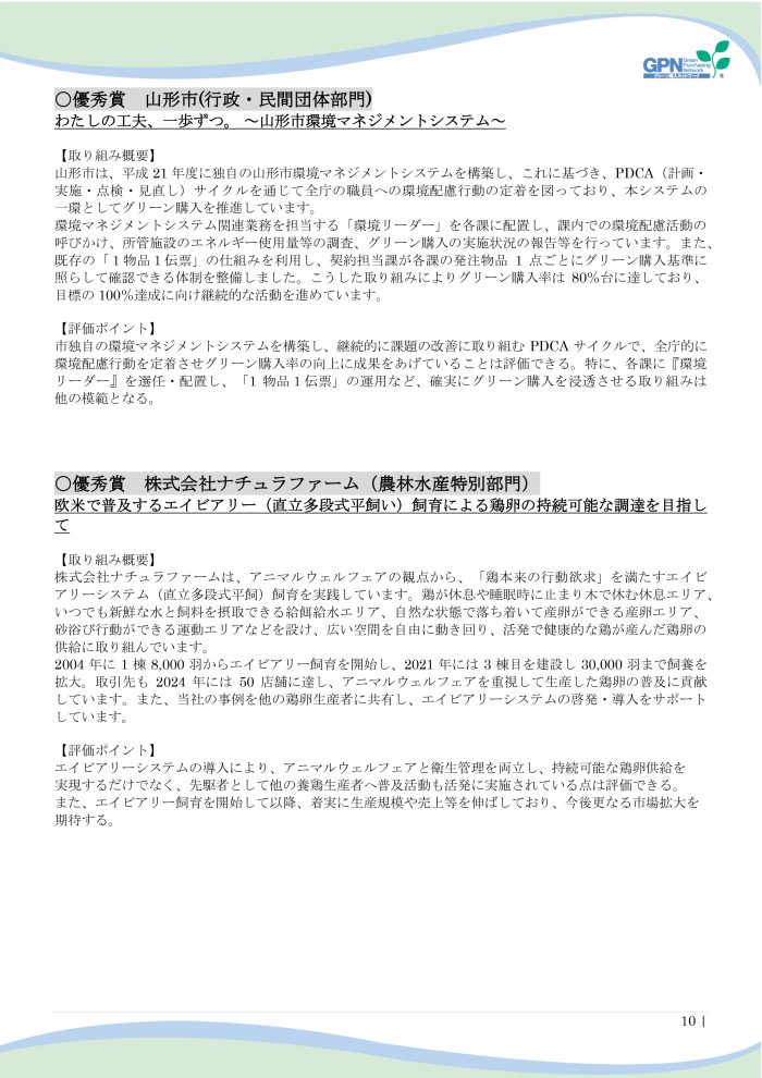 この度、グリーン購入ネットワーク(GPN)が主催する『第26回グリーン購入大賞』の農林水産特別部門において、当農場が取り組む「欧米で普及するエイビアリー(直立多段式平飼い)飼育による鶏卵の持続可能な調達を目指して」が優秀賞を受賞いたしました。
